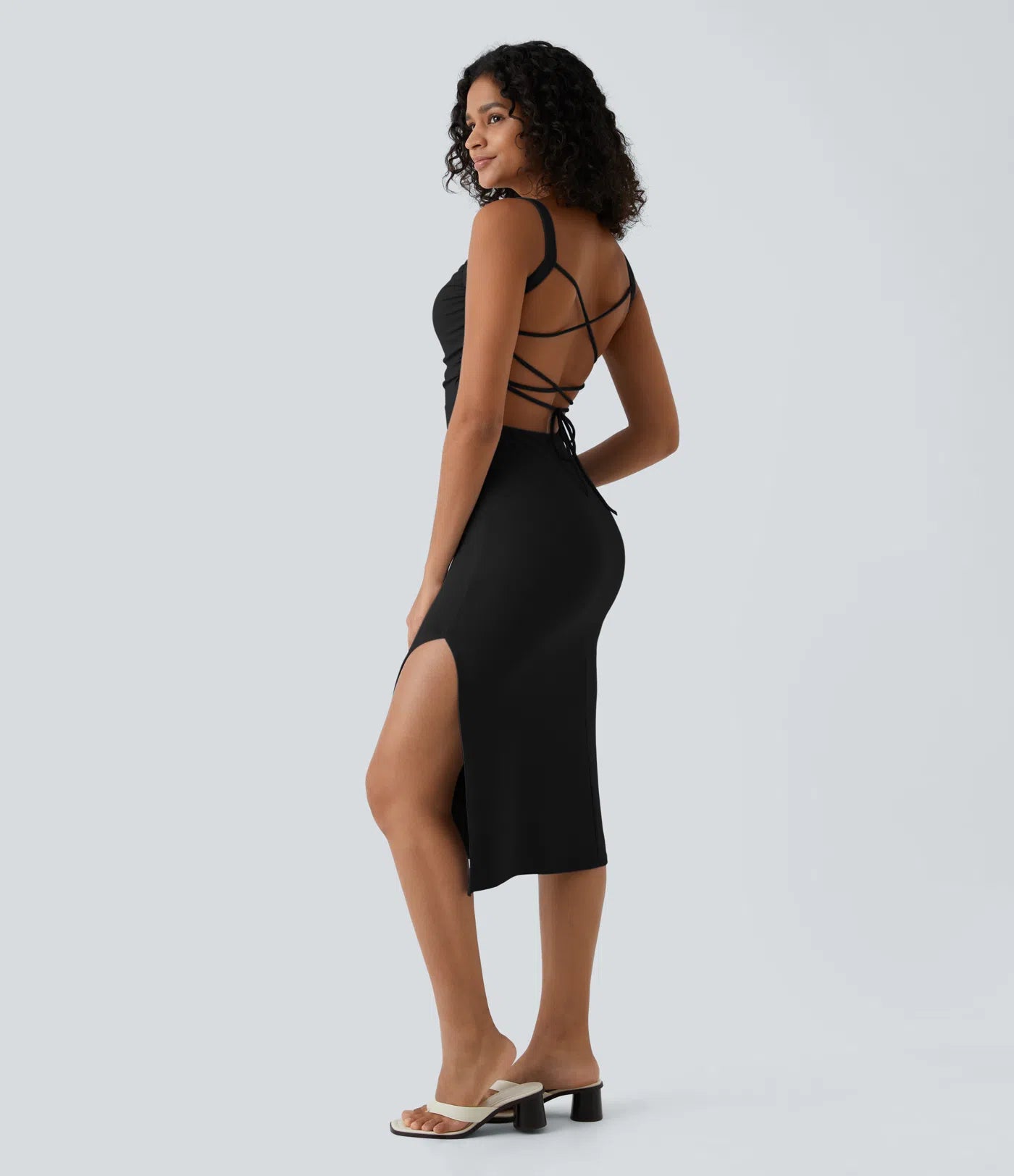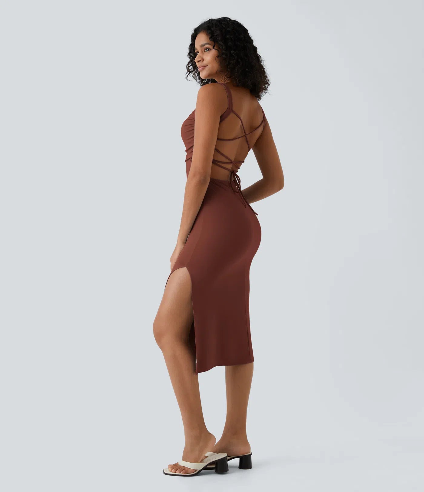 Femora Ruched Backless Crisscross Lace Up Split Bodycon Midi Casual Dress